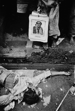 | A corpse and a poster of Sheikh Mujibur Rahman, the person responsible for the uprising of Bangladesh: "...Once 50000 people lived here. Now there were only 200...the rest have fled, leaving the dead on the street..." - Kishor Parekh, Bangladesh War 1971. |